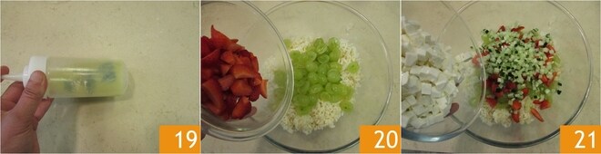 Agitadlo hasta obtener una emulsión 19. Retomad el arroz y verted dentro las uvas, fresas 20, cerezas, pepinos y primosale 21.