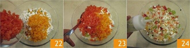 Añadid también el melón y la sandía 22. Mezclad bien 23 y aliñad con la citronette recién preparada 23.
