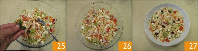 Añadid más hojas de menta 25, mezclad de nuevo 26 y guardad en el frigorífico hasta el momento de servirlo 27.