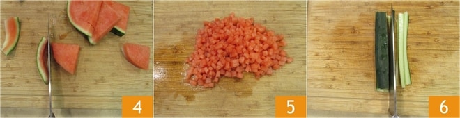 Tomad la sandía, quitad la cáscara 4 y cortadla en cubos de medio cm 5, intentando eliminar también las semillas. Obtened aproximadamente 220 g. Cortad el pepino en rodajas de medio cm, sin pelarlo 6.