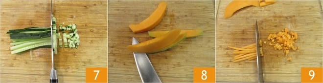 De estas rodajas obtened siempre cubos de medio cm 7. Pasad al melón, eliminad la cáscara y las semillas 8 y reducidlo a cubos de medio cm 9.