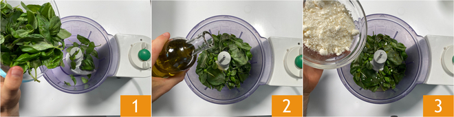 Para preparar la ensalada de arroz con pesto y cítricos, comenzad con el pesto: en el vaso de la batidora, colocad las hojas de albahaca que habréis lavado y secado delicadamente 1, luego añadid el aceite 2 y el queso rallado 3.