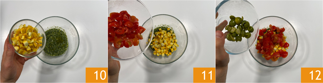 Añadid los calabacines al bol con el pesto 10, junto con los tomatitos cortados en cuartos 11 y las aceitunas deshuesadas 12.