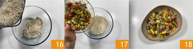 Escurrid el arroz al dente y dejadlo enfriar, luego pasadlo a un bol grande 16. Añadid el condimento ya bien frío 17 y mezclad bien para amalgamarlo todo. Servid inmediatamente vuestra ensalada de arroz con pesto y cítricos o dejadla enfriar en la nevera por otra media hora 18.