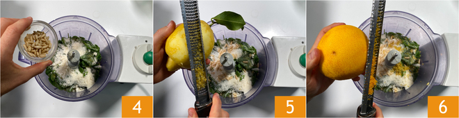 Añadid también los piñones 4 y la cáscara rallada del limón 5 y de la naranja 6.