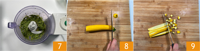 Batid a intervalos repetidos hasta obtener una mezcla cremosa 7. Pasad el pesto a un bol grande y reservad. Pasad al condimento: despuntad los calabacines amarillos 8 y cortadlos en cubos de 1 cm 9.