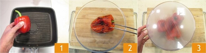 Para preparar la ensalada de arroz con pimientos asados y crema de mozzarella lo primero que debes hacer es poner una olla llena de agua salada al fuego, que servirá para la cocción del arroz. Ahora lava bien los pimientos, colócalos en una parrilla caliente 1 y cocínalos hasta que estén tiernos y bien dorados, girándolos a menudo. Tomará alrededor de 20-25 minutos. Luego transfiérelos a un bol 2 y cubre con film transparente 3 para facilitar posteriormente la eliminación de la piel.