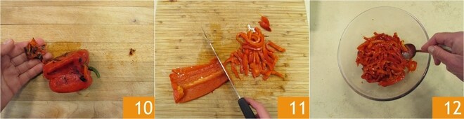 Retoma los pimientos ya tibios y pélalos 10. Ábrelos por la mitad y elimina tanto las semillas como el tallo. Luego corta tiras de aproximadamente ½ cm 11. Transfiérelas a un bol y condimenta con sal, aceite y pimienta 12.