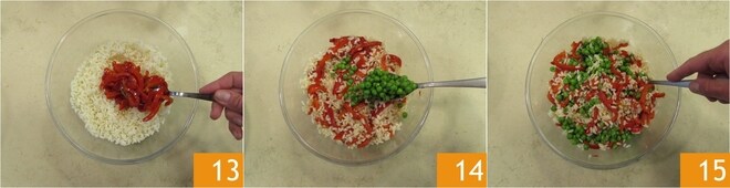 Agrega al arroz los pimientos asados con su condimento 13 y los guisantes sin el chile 14. Mezcla todo bien 15 y reserva para que tome sabor.