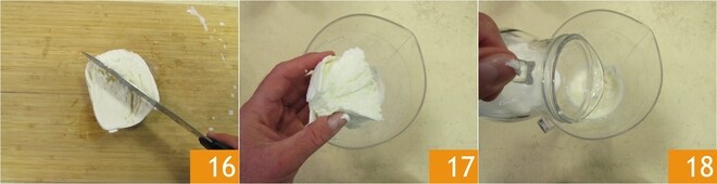 Ahora pasa a la crema de mozzarella. Corta el fiordilatte en piezas 16 y transfiérelas a un recipiente alto y estrecho 17. Luego añade la nata 18 y tritura todo.