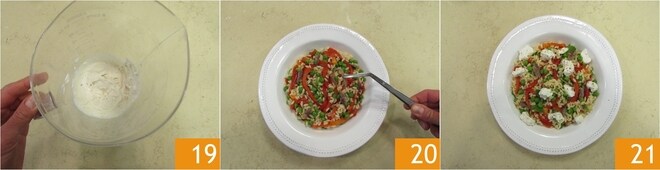 Debes obtener una crema lisa y densa 19. Emplata el arroz tibio con pimientos y guisantes, añade las anchoas troceadas 20 y decora con la crema de mozzarella y hojas de menta fresca 21.