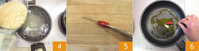 Tan pronto como el agua comience a hervir, echa el arroz 4 y cuécelo durante unos 12 minutos. Luego escúrrelo bien y transfiérelo a un bol grande para que se enfríe. Mientras tanto, prepara también los guisantes. Haz un corte en el chile 5 y transfiérelo a una sartén con un chorrito de aceite 6.