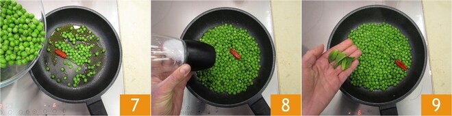 Deja sofreír durante un par de minutos, luego añade los guisantes 7. Sala 8 y deja cocer a fuego vivo durante 5 minutos 8. Luego añade las hojas de menta 9, apaga el fuego y reserva.