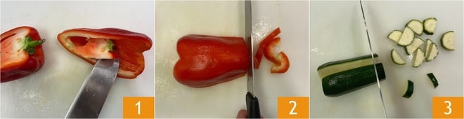 Para realizar la ensalada de arroz con salmón y verduras, primero pon una olla con agua en el fuego para cocer el arroz. Prepara las verduras: divide los pimientos por la mitad y elimina las semillas y filamentos internos 1, luego córtalos en tiras finas 2. Corta los extremos de los calabacines y redúcelos a trozos 3.
