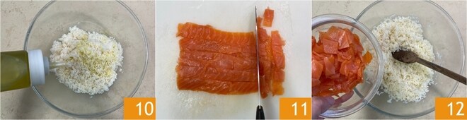 Condimenta con un chorrito de aceite 10, mezcla y deja enfriar a temperatura ambiente. Mientras tanto, corta el salmón ahumado en trozos 11. Añade el salmón al arroz tibio 12.