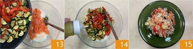 Incorpora también las verduras salteadas 13 y otro chorrito de aceite 14, luego mezcla bien. Puedes disfrutar de tu ensalada de arroz con salmón y verduras de inmediato o, aún mejor, dejarla reposar en el frigorífico durante un par de horas 15.