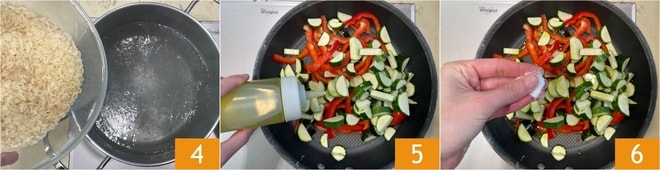 Cuando el agua haya alcanzado el punto de ebullición, añade sal y cuece el arroz durante el tiempo indicado en el paquete 4. Mientras tanto, vierte las verduras en una sartén y condimenta con aceite 5 y sal 6.