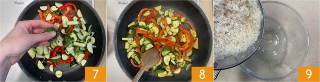 Añade también el perejil picado 7 y cocina las verduras a fuego alto durante unos minutos: no deben quedar demasiado blandas, sino todavía crujientes 8. Una vez cocido, escurre el arroz y transfiérelo a un bol grande 9.