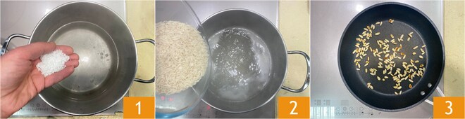 Para preparar la ensalada de arroz invernal con grelos y Ragusano, empieza cocinando el arroz basmati en agua hirviendo con sal, durante el tiempo indicado en el paquete 1 2. Mientras tanto, en una sartén amplia antiadherente, tuesta los piñones 3, rotando a menudo la sartén para un dorado uniforme: tomará unos pocos minutos.