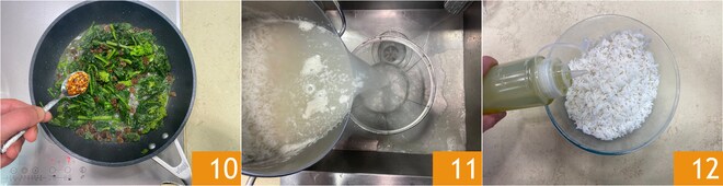 Añade también la guindilla seca 10. Escurre el arroz 11 y transfiérelo a un bol grande, luego condimenta con un chorrito de aceite 12.