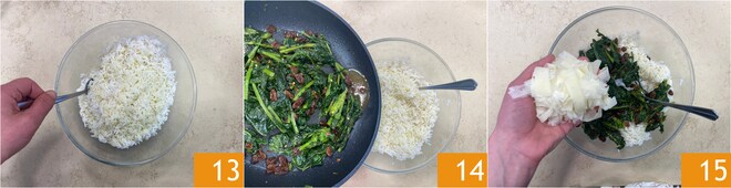 Mezcla 13, añade los grelos condimentados 14 y deja que se temple. Añade en este punto también el queso Ragusano 15.