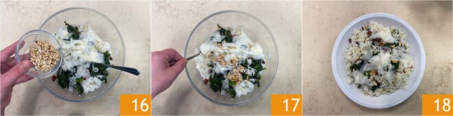 Poco antes de servir, completa con los piñones tostados 16 y mezcla 17. ¡Aquí tienes lista tu ensalada de arroz invernal con grelos y Ragusano 18!
