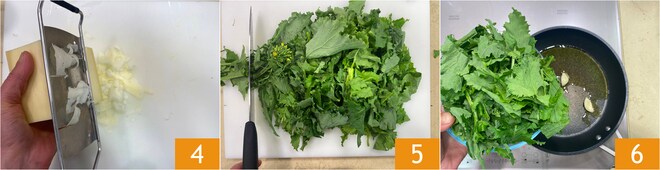 Remoja las pasas durante unos 10 minutos. Mientras tanto, corta lascas del queso Ragusano 4 y limpia los grelos 5, lávalos, sécalos y viértelos en la sartén con 2 dientes de ajo sin pelar y un chorrito de aceite 6.