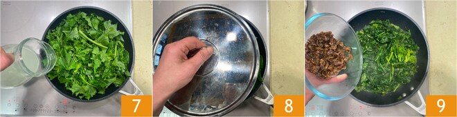 Para que se ablanden mejor puedes humedecer con un par de cucharones de agua de cocción del arroz 7, luego cubre con la tapa 8 y cocina durante unos 10 minutos a fuego medio, recordando mezclar y controlar de vez en cuando. Una vez listos, añade las pasas escurridas a la sartén con los grelos 9.