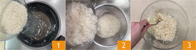 Para realizar la ensalada de arroz tabulé, lleve a ebullición una olla de agua, luego agregue sal y cocine el arroz durante el tiempo indicado en el paquete 1. Una vez cocido, escurra el arroz 2 y transfiéralo a un bol 3. Deje enfriar.
