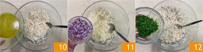 Recupere el bol con el arroz y aderece con la citronette 10, luego añada la cebolla 11 y el perejil picado 12.