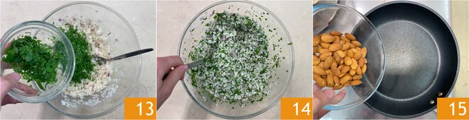 Añada también la menta picada 13 y mezcle bien todo 14. Finalmente, tueste las almendras en una sartén antiadherente a fuego medio, teniendo cuidado de no quemarlas 15.