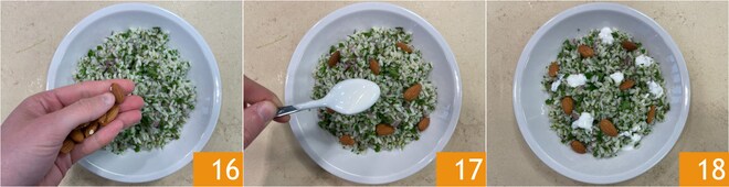 Emplate el arroz aderezado y adorne con las almendras tostadas 16 y unas cucharaditas de yogur 17. ¡Su ensalada de arroz tabulé está lista para ser servida 18!