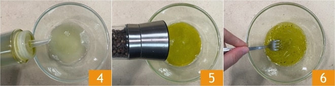 Mientras tanto, prepare la citronette: exprima el jugo de limón en un bol pequeño, luego añada aceite 4, sal y pimienta 5. Mezcle para emulsionar 6.
