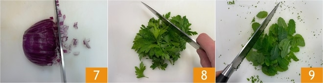 Limpie y corte la cebolla en brunoise, es decir, en cubos muy pequeños 7. Pique finamente el perejil 8 y la menta 9, que previamente habrá lavado y secado.