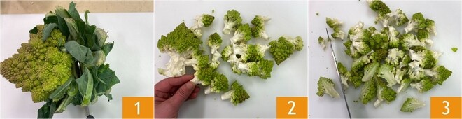 Para realizar la ensalada de arroz templada con tres tipos de brócoli primero limpia y corta los brócolis: retira la base y las hojas del brócoli romanesco 1, luego separa las florecillas 2, dividiendo las más grandes en trozos más pequeños 3.