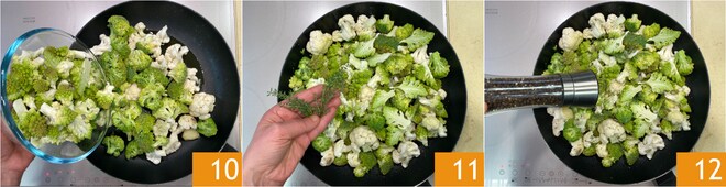 Agrega también el brócoli romanesco 10, las ramitas de tomillo 11, sal y pimienta 12.