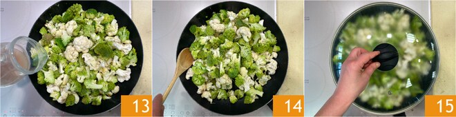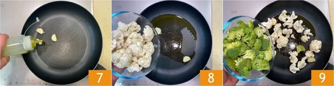 Vierte un chorrito de aceite en una sartén amplia y deja que se insaporice con 2 dientes de ajo 7, luego añade la coliflor 8 y el brócoli 9.