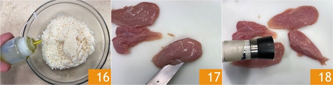 Transcurrido el tiempo de cocción del arroz, escúrrelo y resérvalo en un bol, condimentado con un chorrito de aceite 16. Mientras los brócolis se cocinan, ocúpate del pollo: corta las pechugas de pollo por la mitad horizontalmente 17, luego sazona con sal 18 y pimienta.