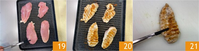 Coloca las pechugas de pollo en una parrilla bien caliente y cocina por ambos lados durante un total de 10-15 minutos (el tiempo puede variar según el grosor de la carne) 19 20. Una vez cocido, reserva momentáneamente el pollo 21.