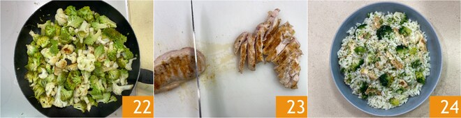 Transcurridos los 20 minutos de cocción de los brócolis, retira la tapa y elimina los dientes de ajo, luego sube el fuego y saltéalos brevemente para dorarlos; es preferible no mezclar, sino limitarse a mover la sartén 22. En este punto, corta la pechuga de pollo en rodajas y únela al arroz, que habrás mezclado con los brócolis 23. ¡Tu ensalada templada con tres tipos de brócoli está lista para ser disfrutada 24!