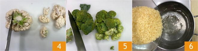 Haz lo mismo con la coliflor 4 y con el brócoli 5. Mientras tanto, lleva a ebullición una olla con agua salada y cocina el arroz durante el tiempo indicado en el paquete 6.