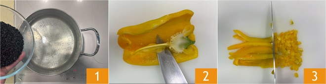 Para preparar la ensalada de arroz venere con verduras y gambas, primero pon a cocer el arroz venere en agua hirviendo con sal 1. Mientras tanto, corta los pimientos amarillos, elimina el tallo, las semillas y los filamentos internos 2. Luego córtalos en tiras, y después en pequeños cubos 3.