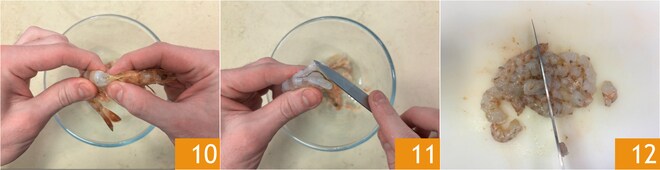 Ahora dedícate a limpiar las gambas. Quita la cabeza, la cola y el caparazón 10, elimina el intestino 11 y corta la pulpa en trozos 12.