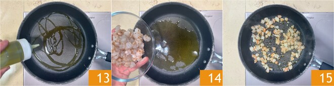 Vierte un poco de aceite en una sartén 13, añade las gambas 14, saltéalas durante 1-2 minutos 15 y reserva.