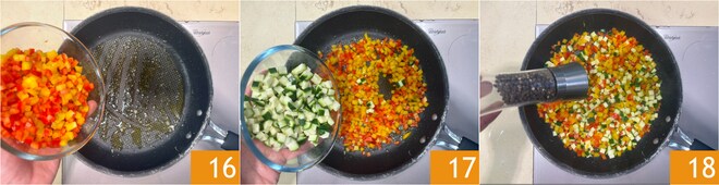 En la misma sartén pon los pimientos 16 y los calabacines 17. Ajusta de sal y pimienta 18 y cocina salteando.