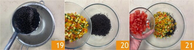 Escurre el arroz 19 y recógelo en un bol grande. Déjalo enfriar completamente. Luego añade las verduras salteadas 20 y los tomates 21.