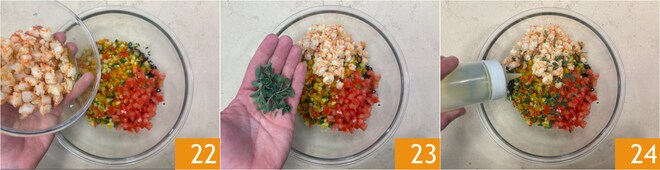 Añade las gambas 22, la mejorana fresca 23 y un poco de aceite 24.