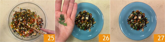 Mezcla todo 25 y emplata. Completa con algunas hojas más de mejorana 26. La ensalada de arroz venere con verduras y gambas está lista para ser servida 27.