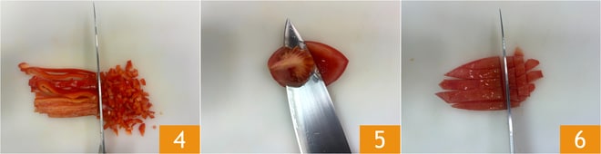 Haz lo mismo con los pimientos rojos 4. Corta los tomates por la mitad y elimina las semillas y la pulpa 5, luego redúcelos a cubos 6.