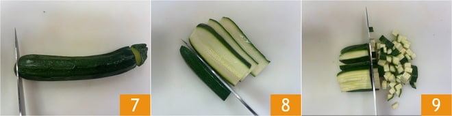 Recorta los extremos de los calabacines 7, córtalos en rodajas 8 y luego en cubos 9.